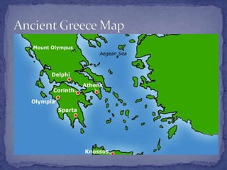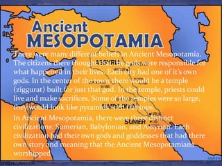 Ancient Mesopotamians believed that gods controlled their lives and each city had its own patron god housed in a central temple. They also believed in demons that could reward or punish humans. Some important gods included An, Enki, Inanna, Nanna, and Utu. Ancient Egyptians also had many gods like Ra, Isis, Osiris, Horus and Thoth and built temples to worship them. They believed in an afterlife consisting of two parts, the Ka and Ra, and mummification helped preserve the body. Greeks believed in gods living on Mount Olympus like Zeus, Hera and Poseidon that explained natural phenomena. Romans adopted Greek gods but with changed names and also believed spirits
