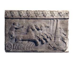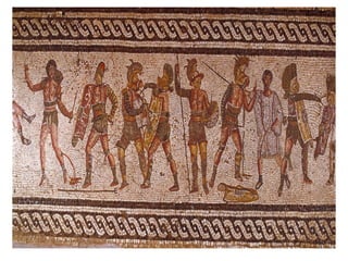 The document provides details about daily life and entertainment in ancient Rome. It describes how Romulus and Remus founded Rome after being raised by a she-wolf. It then discusses common activities like board games for soldiers, gladiator fights that could end in death, comedic and dramatic theater performances, and large public baths that served as social hubs. Finally, it mentions the dangerous chariot races that were a popular spectator sport in the Circus Maximus stadium.