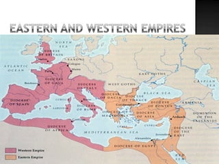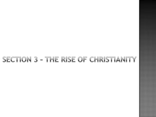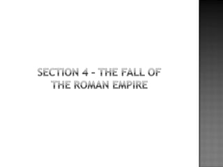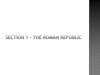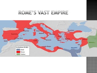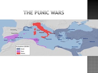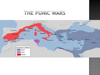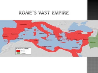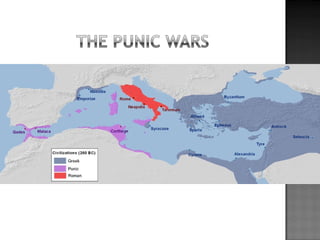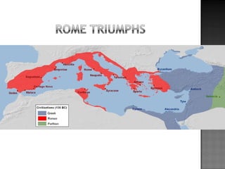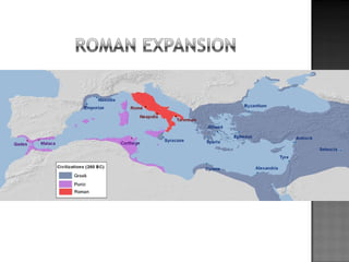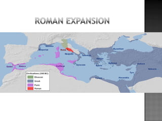 The document provides background on the founding and early history of Rome. It describes how Romulus and Remus founded Rome after being raised by a she-wolf. Over time Rome became a large, prosperous city under Etruscan kings. The Romans then overthrew the Etruscans and established a republic with elected leaders. Rome expanded across Italy and the Mediterranean, fighting three Punic Wars against Carthage to gain dominance of the region.