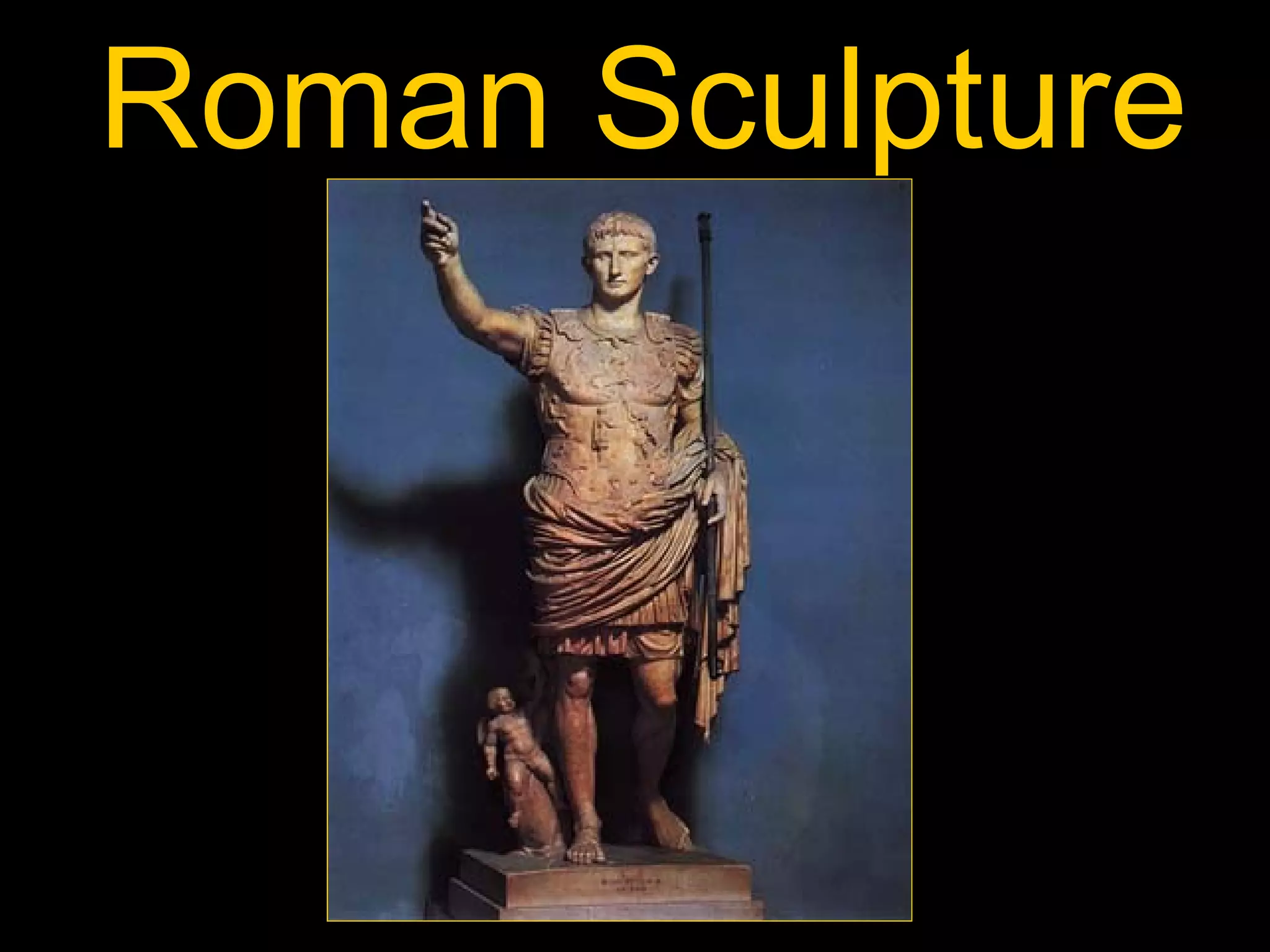 Roman sculpture evolved over time from the Republican to Imperial eras. Republican busts were highly realistic portraits meant to convey virtues like wisdom. Early Imperial sculptures idealized emperors and referenced classical Greek styles. Notable works include the Augustus of Primaporta statue and reliefs on Trajan's Column commemorating military victories. Roman sculpture was used both for portraiture and propagandistic and commemorative monuments, conveying Roman cultural values of leadership, heritage, and military success.