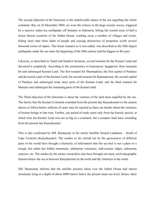 The document provides details about the ancient Tamil civilization that flourished in Tamil Nadu between 3500 BC and 500 BC. It discusses the existence of a land mass called Kumari Land (also known as Lemuria) that extended beyond present-day Kanyakumari before being submerged by the sea. Archaeological evidence like artifacts discovered at sites like Adittanallur dating back to around 2000 BC provide proof of the highly developed nature of the ancient Tamil civilization. The Tamil people had an advanced society with kings, large cities, trade, industries like metalworking and weaving, and an established culture.