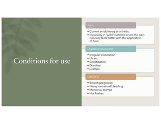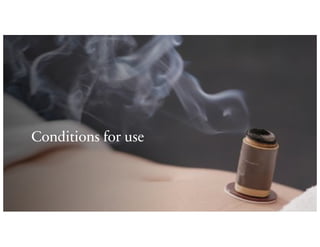 The document outlines the use of moxa sticks for various conditions, detailing how to safely use them for pain relief, digestive issues, and menstrual problems among others. It includes guidelines for application, timing based on Traditional Chinese Medicine's circadian clock, and specific case studies with symptoms and corresponding treatment points. The document emphasizes the integration of acupressure, ear seeds, and moxibustion for comprehensive care.