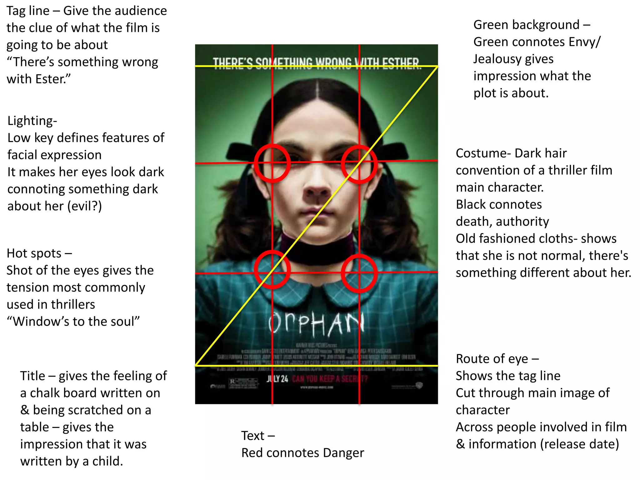 This document provides visual analysis of film marketing materials including magazine covers and posters. It analyzes elements like fonts, colors, lighting and composition that are used to attract attention and convey information about the genre and plot of films. Facial close-ups and dark tones are highlighted as conveying a sense of thriller or danger. Larger text and central placement are noted as drawing focus to the main story or film being promoted through the marketing pieces. In total, the document examines how visual design choices work to intrigue audiences and clue them in on what to expect from the films.