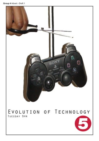 This document contains draft materials for Group 4, including draft advertisements and a double page spread. It summarizes the key points of a documentary that explored the evolution of technology over generations, focusing on computers, phones, and games. The documentary showed how video game graphics have improved dramatically over the years. It also examined how violence and the sexualization of women have become normalized in many modern video games. One public member quoted in the documentary stated that "most women are used as sex slaves" in today's games.