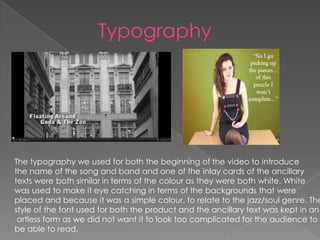 The document discusses the typography, mise-en-scene, and color choices for both a music video project and accompanying ancillary texts designed to resemble jazz/soul genre conventions of the 1960s. For both, a simple white typography was used against backgrounds to look eye-catching but not complicated. Natural lighting and outfits were employed to seem realistic. Black and white was dominant with hints of color on album covers relating to an uplifting color scene at the video's end. Conventions from artists like John Coltrane informed the designs' old-fashioned aesthetic.