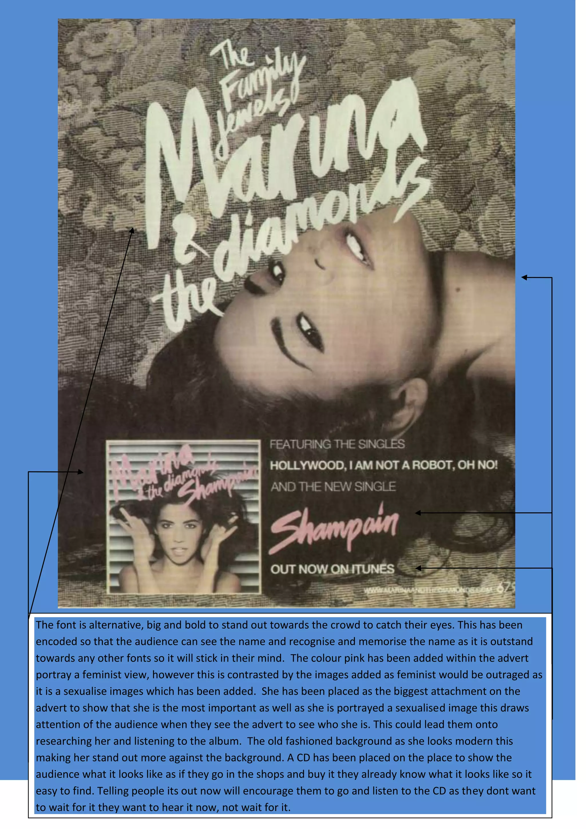 The font used in the advert is large and bold to stand out from other fonts and be memorable. A pink color was added to portray a feminist view, though the sexualized images of women contrast this. The main image takes up the most space to indicate her importance and draw attention, potentially leading viewers to research her and the album. Background details like the CD and release date information help viewers find and engage with the album. The plain background makes the colorful text and images pop out to attract and engage the audience.