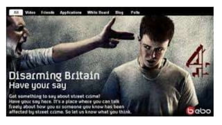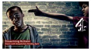 This document analyzes and summarizes the conventions and techniques used in a documentary advertisement. It describes an image showing two boys, one black and one Asian, facing the camera in the street. The black boy looks sad and makes eye contact, engaging viewers and eliciting pity. Text is limited but used to identify the documentary and air time. Color and lighting are used symbolically, with the black boy brightly lit to seem innocent while the other is in shadow. The background suggests a crime-ridden environment and issues faced by young people. Overall, the analysis discusses how the advert uses visual and linguistic elements to intrigue viewers and convey its message in a brief format.