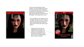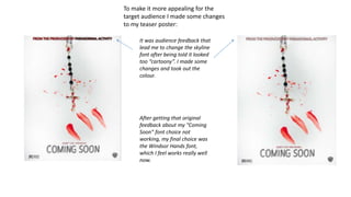 The document discusses changes made to a teaser poster based on feedback received. Feedback led to changing the font from "Coming Soon" to "Windsor Hands", removing color from the skyline font as it looked too "cartoony", and repositioning various elements as the original design was "too crowded". Additional changes included brightening the page by adding a yellow color and repositioning the masthead from the middle to improve attention on other elements based on feedback.