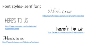 This document discusses font styles for an ancillary product plan. It recommends a serif font and provides links to 4 specific font styles on Fontspace that may be suitable: Penelope Anne, You're Invited, Cookie Monster, and Rochester. The fonts listed are intended to match the genre of the ancillary product.