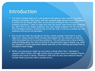 The document analyzes and summarizes two silent comedy film posters: Charlie Chaplin's "The Kid" and Laurel & Hardy's "Towed in a Hole". Key aspects discussed include fonts, images, colors, and how conventions are used to appeal to audiences. Research conclusions note techniques like black and white coloring and facial expressions that will be considered for the author's own silent comedy poster. Studying successful posters allows understanding of how to advertise to the target audience through implicit visual elements.