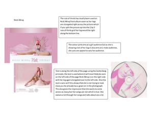 This document analyzes and compares the album covers of Jay-Z, Nicki Minaj, and Coldplay. For Jay-Z's cover, it notes the use of black and white colors along with red accents to create a classy design. It also discusses design elements like the rule of thirds and font choices. For Nicki Minaj's cover, it examines how her elongated legs cross the rule of thirds lines to draw attention. And for Coldplay's cover, it highlights the brighter colors and graffiti style that aim to attract a younger audience compared to their older rock style.