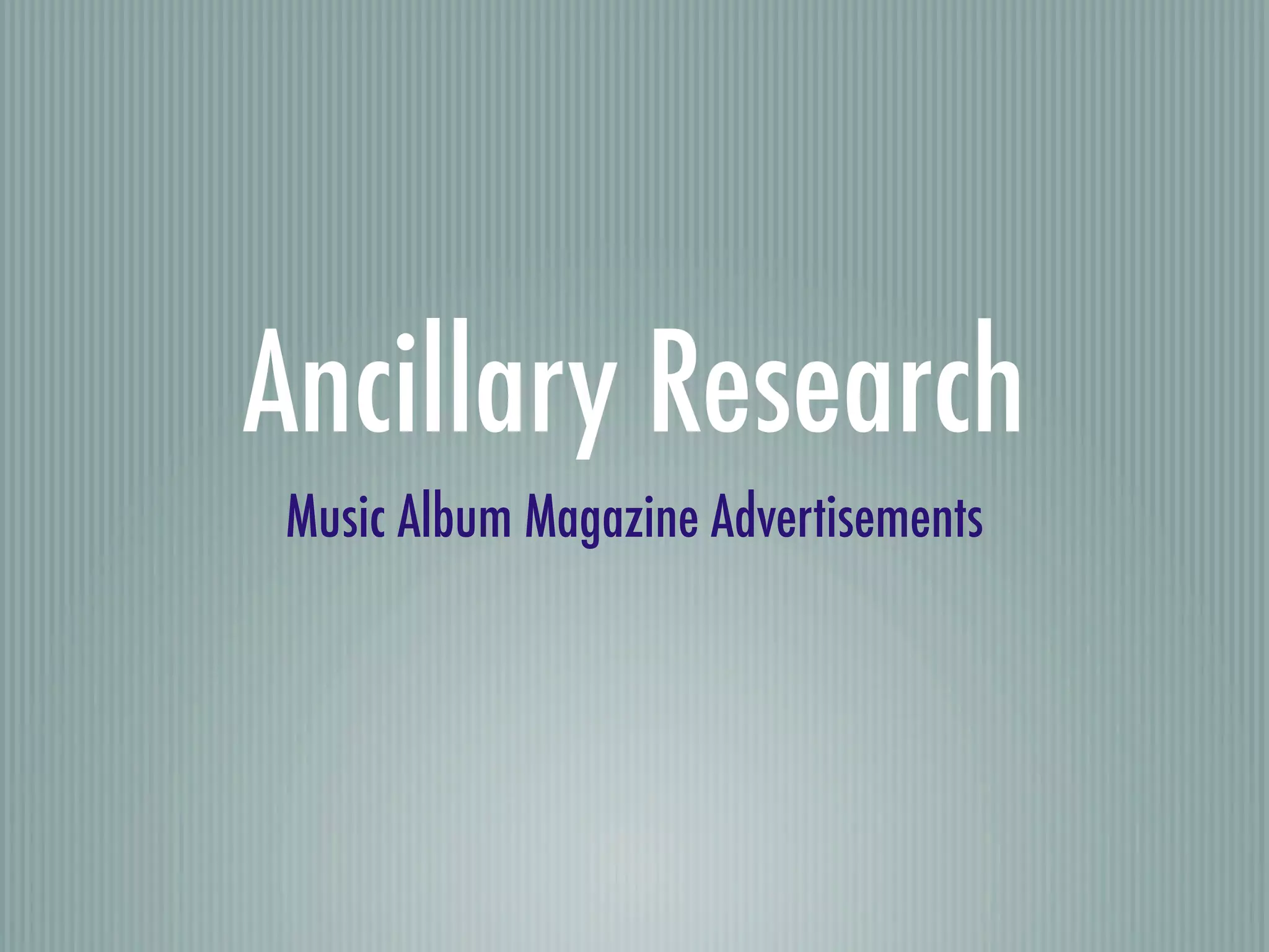 This document discusses conventions used in music album magazine advertisements. It analyzes several advertisements, noting that they typically feature an eye-catching image, prominent display of the artist's name in a unique font style, and a consistent color theme. Specific advertisements are then examined in more detail, highlighting aspects like iconic images, use of fonts, inclusion of reviews or song names, and integration of online sales promotion. Overall trends as well as genre-specific approaches are covered.