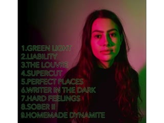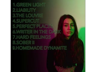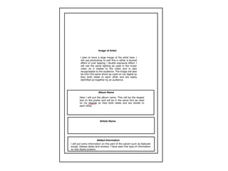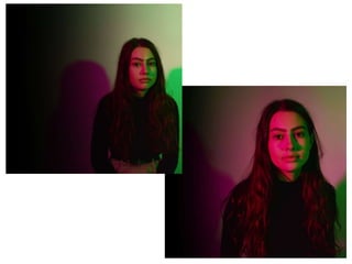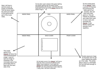 The document summarizes the process of experimenting with lighting and editing photos for a digipak shoot. The photographer used pink and green gels on the lights to achieve different effects and had to lighten the photos in post-production due to the dark colors of the gels. They also edited photos with different light strengths and created a black gradient on the back cover to make the tracklist stand out, adding a glowing green text. Overall, the document outlines the photographer's experimentation with lighting, editing, and design elements for the digipak project.