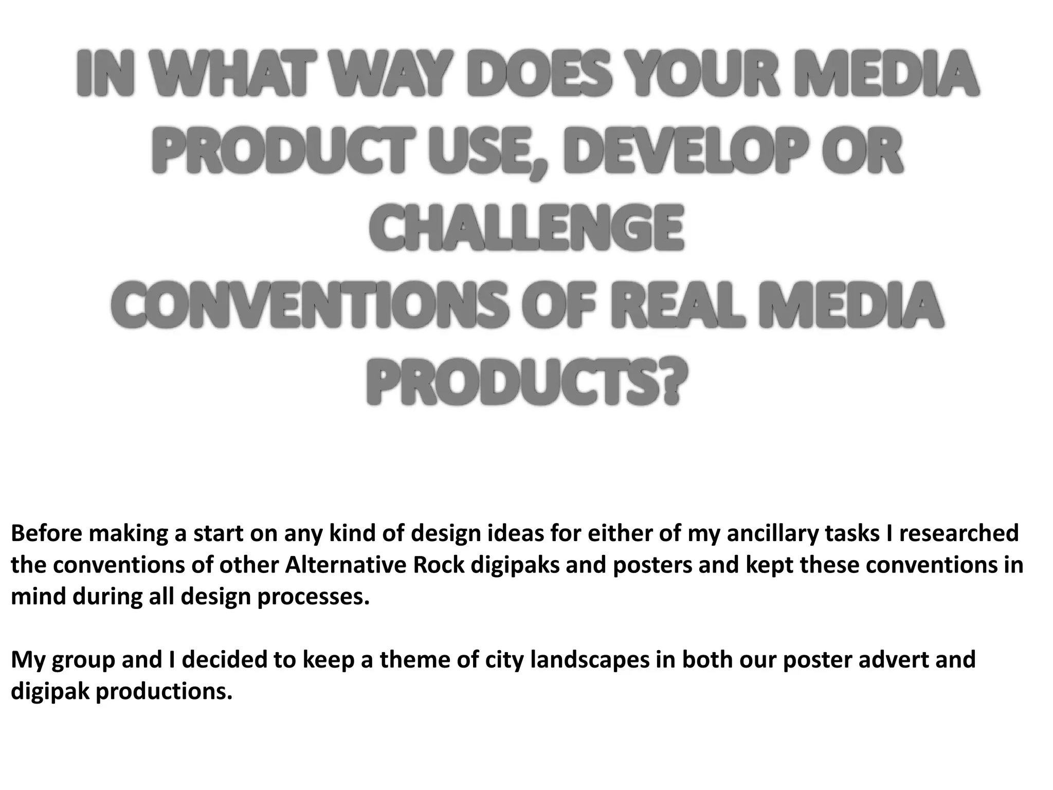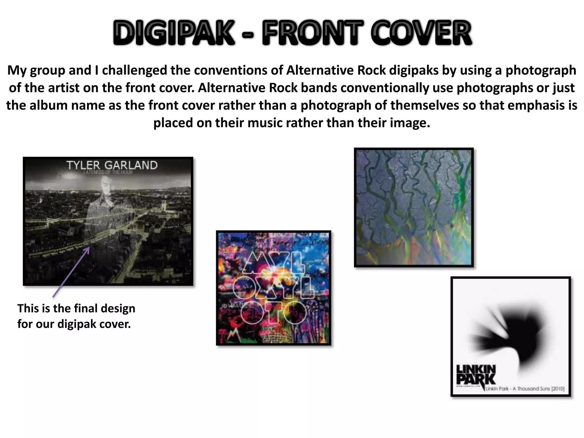 Before beginning their design work, the group researched conventions of alternative rock digipaks and posters. They decided on a theme of city landscapes for their poster and digipak. The group challenged conventions by using a photograph of the artist on the front cover of the digipak, though some mainstream alternative rock artists do this. They received positive feedback despite breaking this convention. They also kept the artist's outfit consistent across the digipak, video, and poster to help audiences identify the performer.