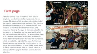 The Bruno Mars website homepage features a looping video of his new single "24K Magic" to promote his latest release. There are navigation menus at the top and bottom of the page with hyperlinks to other sections. A yellow "subscribe" button catches the user's attention. The music video page allows users to easily watch Bruno Mars' hits on different platforms like YouTube, Spotify, and Apple Music. The news page keeps fans informed on Bruno Mars and uses hashtags like "#GRAMMYs" to appeal to younger, social media-savvy audiences. Tour pages advertise Bruno Mars' concerts to increase ticket sales. Backgrounds and lighting effects tie the website's visual design into themes from his "24K Magic" tour. Mer