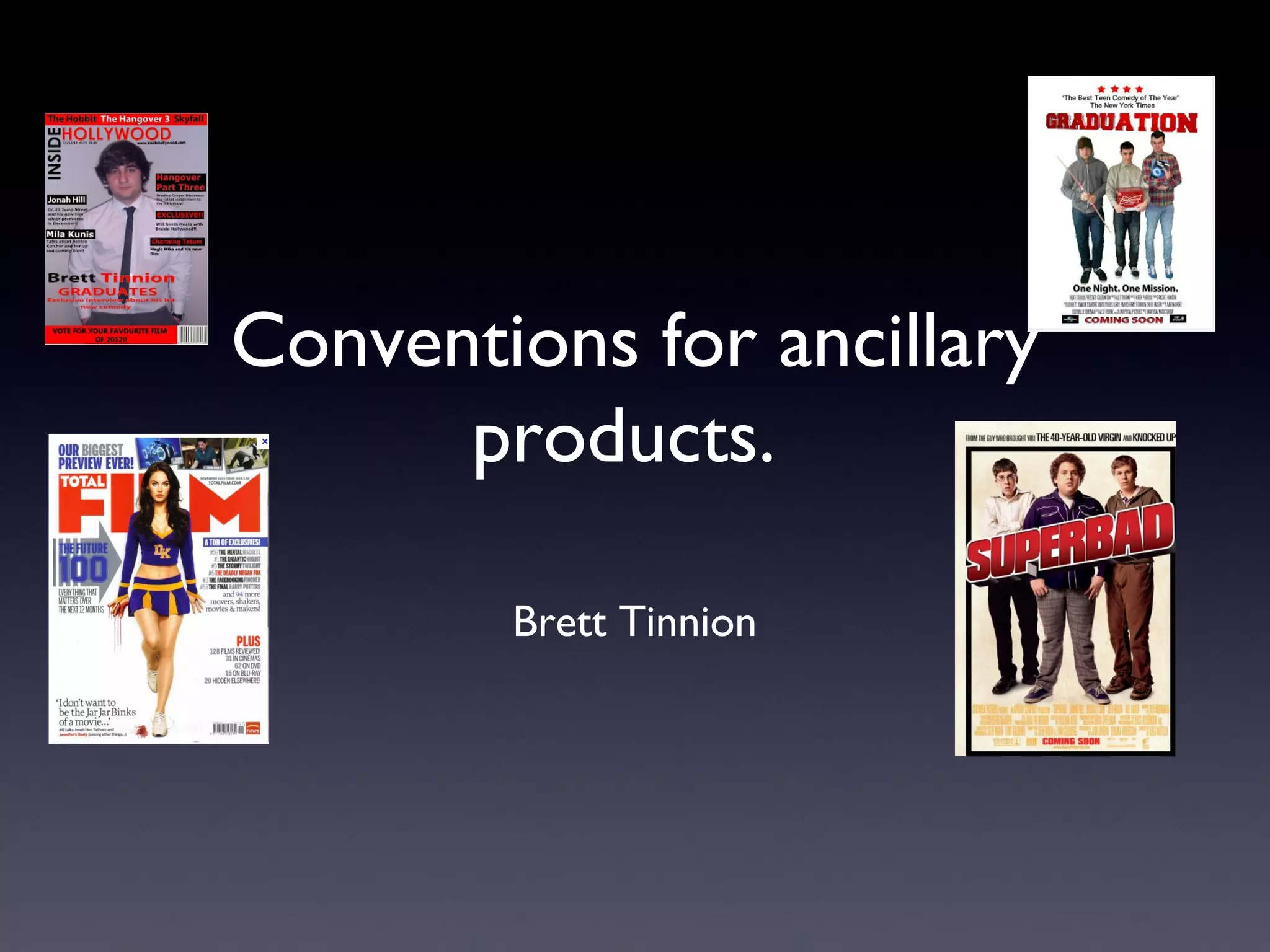 The document discusses conventions for ancillary products like movie posters and magazines. It notes that conventions include using sans serif fonts, prominent placement of the main title in bright colors, images of main characters, credits, and release dates. The document also discusses how the example poster and magazine it created follow conventions like developing a consistent house style, including coverlines and descriptions to entice readers, and using the route of the eye format.