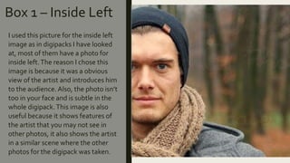This document discusses the design choices for various elements of an album packaging and gig poster. For the inside left of the digipack, a subtle photo of the artist was chosen to introduce them. The CD image leaves room for imagination without identifying text. The inside right features the artist playing guitar to indicate the genre as slow and love-related. An extra panel includes forest imagery and song lyrics. The back cover lists songs and includes something new while maintaining the green theme. The front cover stands out with a warmer color and simpler image. The gig poster uses the same font and front cover image for synergy and artist recognition.