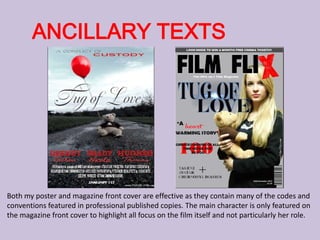 The magazine front cover effectively depicts the genre of drama through its sole focus on the film's main character. Her serious facial expression and the gloomy grey background create an unsettling atmosphere that draws viewers in. Key elements like the masthead, film still, and tagline clearly communicate the magazine's purpose and topic to potential readers. Overall, the simple yet professionally designed cover achieves its goal of enticing audiences to learn more about the films featured inside.