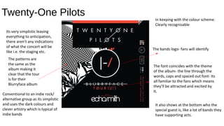 The document analyzes and compares concert posters for several artists, including Twenty One Pilots, Arctic Monkeys, Beyoncé, and The Weeknd. Key points made about the posters include that they coincide with the artists' album themes to attract fans, use simplistic and mysterious designs to generate anticipation, and feature the artists' faces and fonts to draw attention and identification. Common conventions across the posters include including supporting acts and sponsors to showcase the scale of the events.