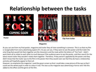 Bethany Harvey created a poster, magazine, and trailer for a film project. She ensured they were recognizably related through shared elements like characters, fonts, and color schemes using black, red, and white, which represent the horror genre. While the poster, magazine, and trailer all reference each other through these visual cues, she varied the specific images and fonts used between pieces to avoid making the connections too overt or repetitive for audiences. The shared stylistic elements give the materials a cohesive identity while still maintaining some independence.