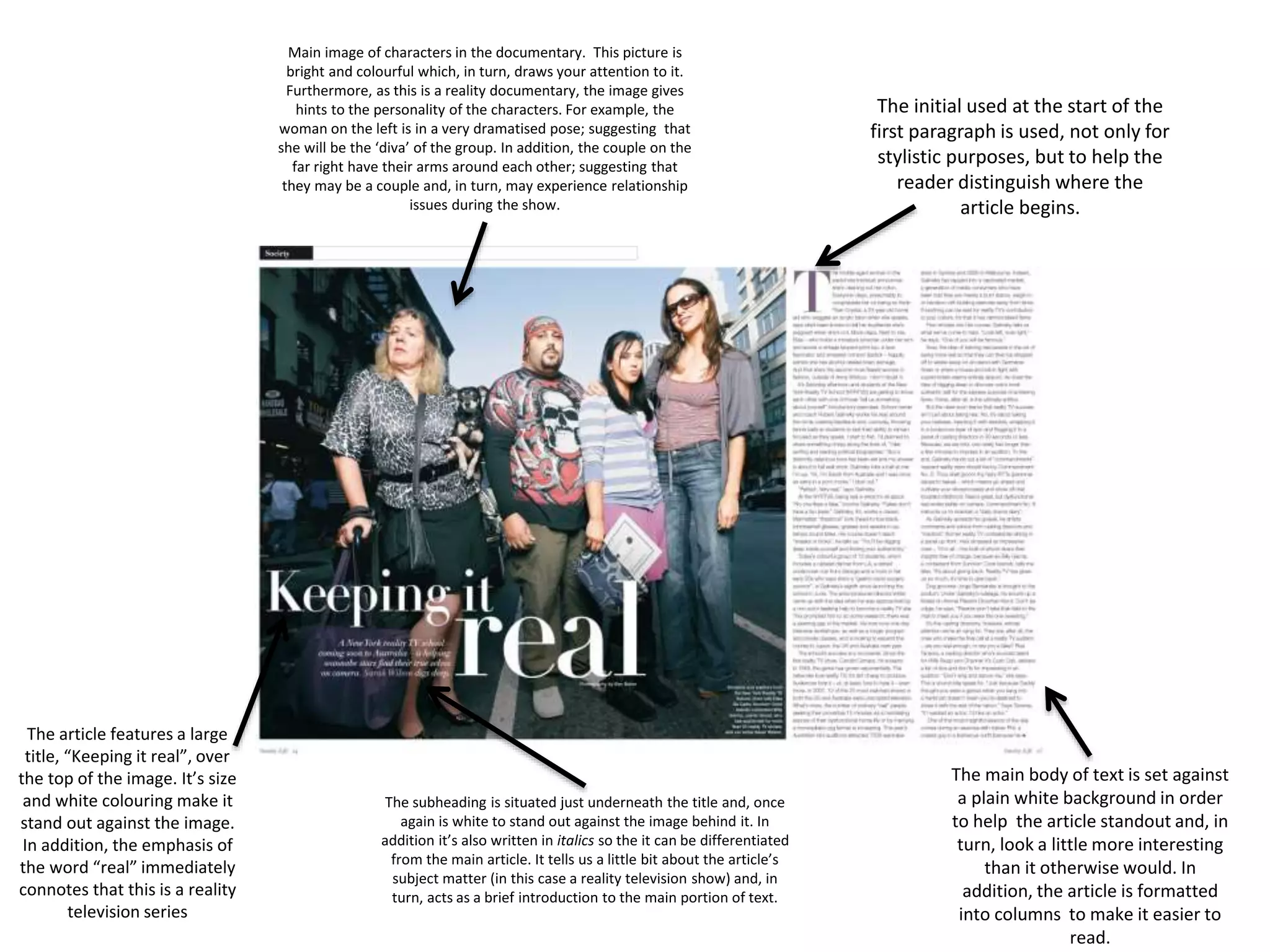 The document provides details on the layout and design of a magazine article. It examines various design elements including images, headings, subheadings, fonts, and column formatting. These elements are used to clearly convey the topic of the article, guide the reader through the content, and make the article visually appealing. For example, large colorful images are used to draw attention and hints are provided about characters. Headings are prominently displayed in white fonts against images. The article is formatted into columns for easy reading.