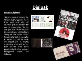 The document discusses the design of various materials to promote an indie artist, including a digipak, magazine advertisement, and their analysis. It examines examples from other artists and incorporates conventions of the indie genre. The final designs chosen for the digipak and magazine ad utilize consistent imagery, fonts, and colors to create recognition and brand identity while maintaining an indie aesthetic focused on the music over the individual artist.