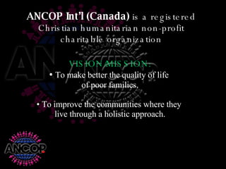 GK (Gawad Kalinga) is a community development program in the Philippines that aims to transform slums into clean, beautiful homes and communities through integrated shelter, livelihood, health, and education programs. It involves building 700,000 homes in 7,000 communities over 7 years. A GK home costs $1,500 CAD to build and provides residents with a modest living space as well as a renewed sense of dignity and hope. The program is funded through donations to ANCOP, a Canadian nonprofit, with minimal overhead such that $1,500 CAD results in a home valued at $2,500 CAD.