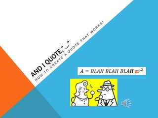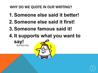 This document provides guidance on how to properly incorporate quotes into academic writing. It discusses why quotes are used, such as to support a point or attribute an idea to its originator. Key recommendations include introducing and explaining the relevance of any quote, and citing the quote's source both in the body of the text and in a concluding bibliography. Examples demonstrate correct versus incorrect ways to quote, introduce quotes, and format citations in MLA style. The overall message is that quotes should be used purposefully and attributed properly.