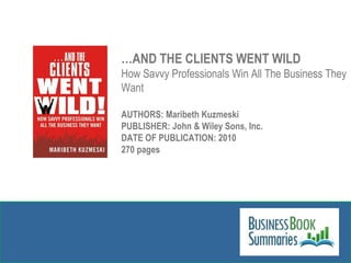 In '...and the clients went wild!', Maribeth Kuzmeski outlines five key marketing principles for cultivating customer loyalty and generating business success. These principles include differentiating offerings, focusing on customer benefits, employing viral marketing, leveraging business networks for growth, and emphasizing execution over strategy. The book serves as a practical guide for companies seeking to build strong emotional connections with their clients and enhance their brand identity.