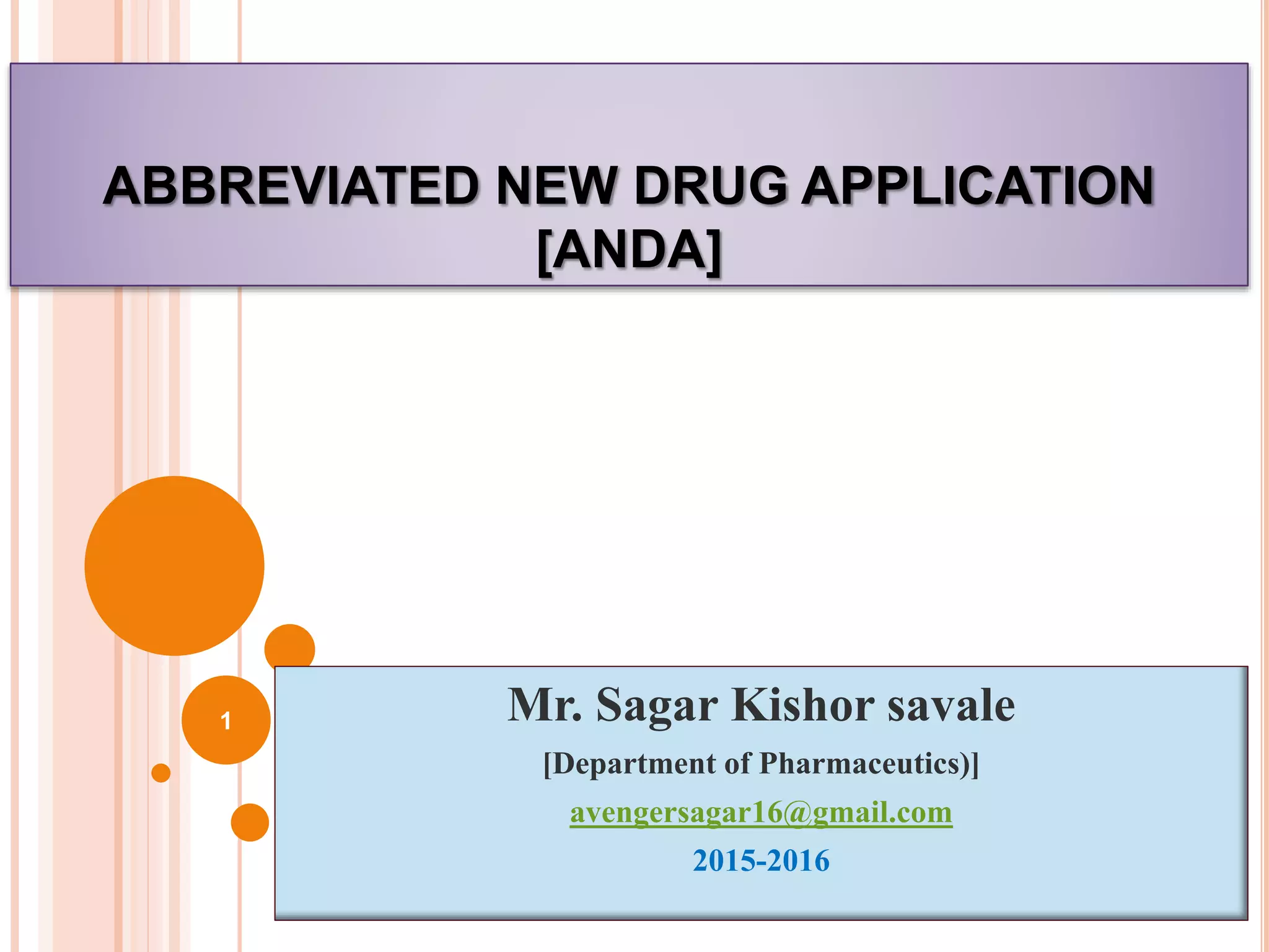 The document provides information about abbreviated new drug applications (ANDAs), which are designed to allow approval of generic drug products that are equivalent to already approved brand name drugs. An ANDA must show a generic drug is comparable to the reference drug in dosage form, strength, quality and performance. It does not require preclinical and clinical trials but must demonstrate bioequivalence through bioavailability and bioequivalence studies. The ANDA contents and review process are outlined according to the Common Technical Document format in five quality, nonclinical, and clinical modules.