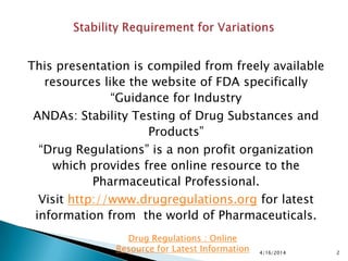 This presentation provides guidance on stability testing requirements for new drug applications (ANDAs) as outlined by the FDA and ICH regulations. It emphasizes the necessity for stability data from pilot and/or small scale batches, including 6 months of accelerated and long-term conditions, and details submission protocols and expectations for manufacturing and packaging processes. Additionally, it highlights that compliance with these guidelines is essential for the approval of drug substances and products under the FDA's regulatory framework.