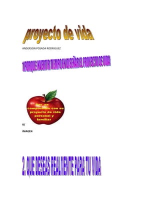 Este documento presenta la información personal de Anderson Posada Rodriguez. Incluye su imagen, una lista de sus fortalezas y debilidades, y una tabla con metas a corto, mediano y largo plazo relacionadas con sus estudios y carrera profesional, junto con las acciones requeridas y los tiempos estimados para alcanzar cada meta.