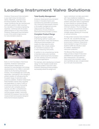 Anderson Greenwood Instrumentation is a leading provider of instrument valves, manifolds, and enclosure systems. They offer a full range of products for applications in industries such as aerospace, oil and gas, and more. Their valves, manifolds, and enclosures are manufactured to high quality standards using materials like stainless steel, Hastelloy, and others. They have over four decades of expertise in engineering instrumentation solutions and set standards in the field in the 1950s.