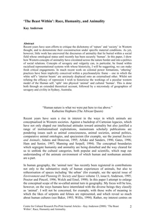 This document provides an overview and pre-print of an article titled "'The Beast Within': Race, Humanity, and Animality" by Kay Anderson. The article explores how concepts of animality have circulated in Western thought and been used to construct social differences and hierarchies. It examines how ideas like savagery and vulgarity, associated with proximity to nature, have informed the representation of racialized groups. While previous work has emphasized the psychoanalytic idea of repressing interior beasts through projecting them onto externalized others, the article aims to historicize the Western model of a divided human self between physical animal nature and cultural humanity. It provides theoretical context and then gives a case study of how notions of savagery and c