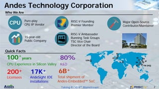 This document discusses Andes Technology Corporation's RISC-V processor IP solutions. It summarizes that Andes is a leading RISC-V CPU IP vendor that provides a portfolio of RISC-V processor cores ranging from embedded control to application processing. It also develops tools like the AndeSight IDE and provides customization services through its AndeSentry security framework and scalable acceleration architecture.