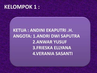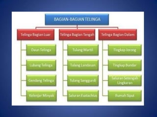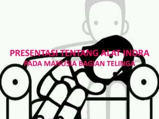 Dokumen ini membahas tentang alat indra manusia, khususnya telinga, yang terdiri dari bagian luar, tengah, dan dalam, serta fungsinya dalam mendengar dan menjaga keseimbangan. Selain itu, dijelaskan berbagai jenis penyakit yang dapat mempengaruhi telinga, termasuk penyebab, gejala, dan cara penanganannya. Presentasi ini disusun oleh kelompok yang terdiri dari Andini, Andri, Anwar, Frieska, dan Verania.