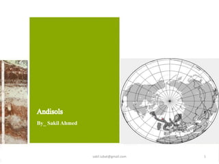 Andisols are a soil order formed from volcanic ash and cinder deposits. They largely consist of non-crystalline minerals like allophone and imogolite that form strong bonds with organic matter. Andisols are typically light, fluffy soils that hold a lot of water like a sponge. While fertile soils when not highly weathered, volcanic soils can complex with phosphorus and require additions of organic matter, lime or fertilizer to maintain fertility.