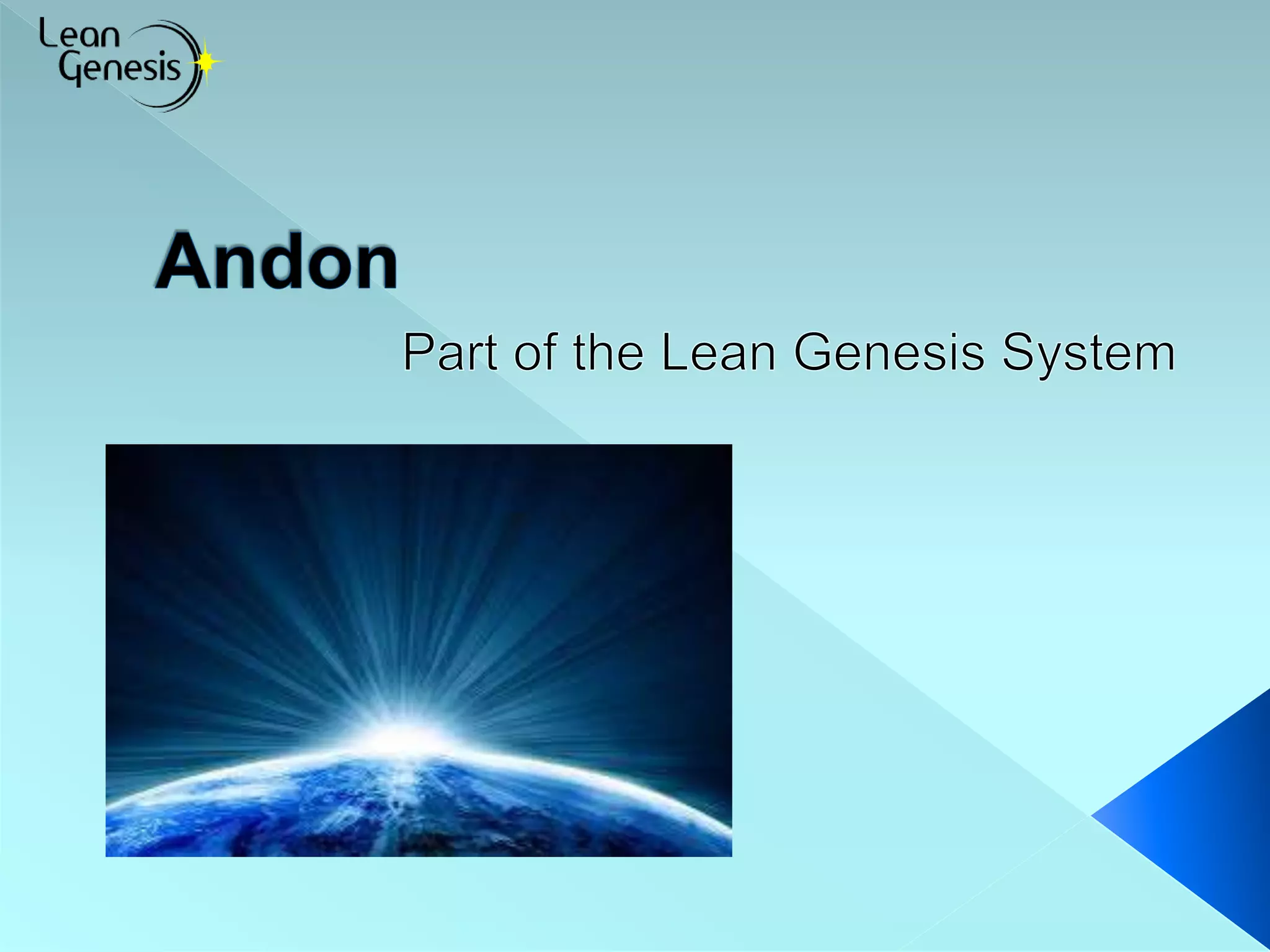 The document discusses Andon, a visual signaling system used in factories to indicate issues that need attention. It suggests Andon signals can be lights or sounds and should be placed where operators and support staff can see or hear them. Locations can include operator stations, automated equipment, and areas needing monitoring. The document stresses determining signal needs, establishing protocols, training employees, and monitoring usage to ensure Andon is used effectively and problems are solved rather than just reacted to. It notes Andon implementation can range in cost but the most important factor is developing a culture where problems are stopped and supported.