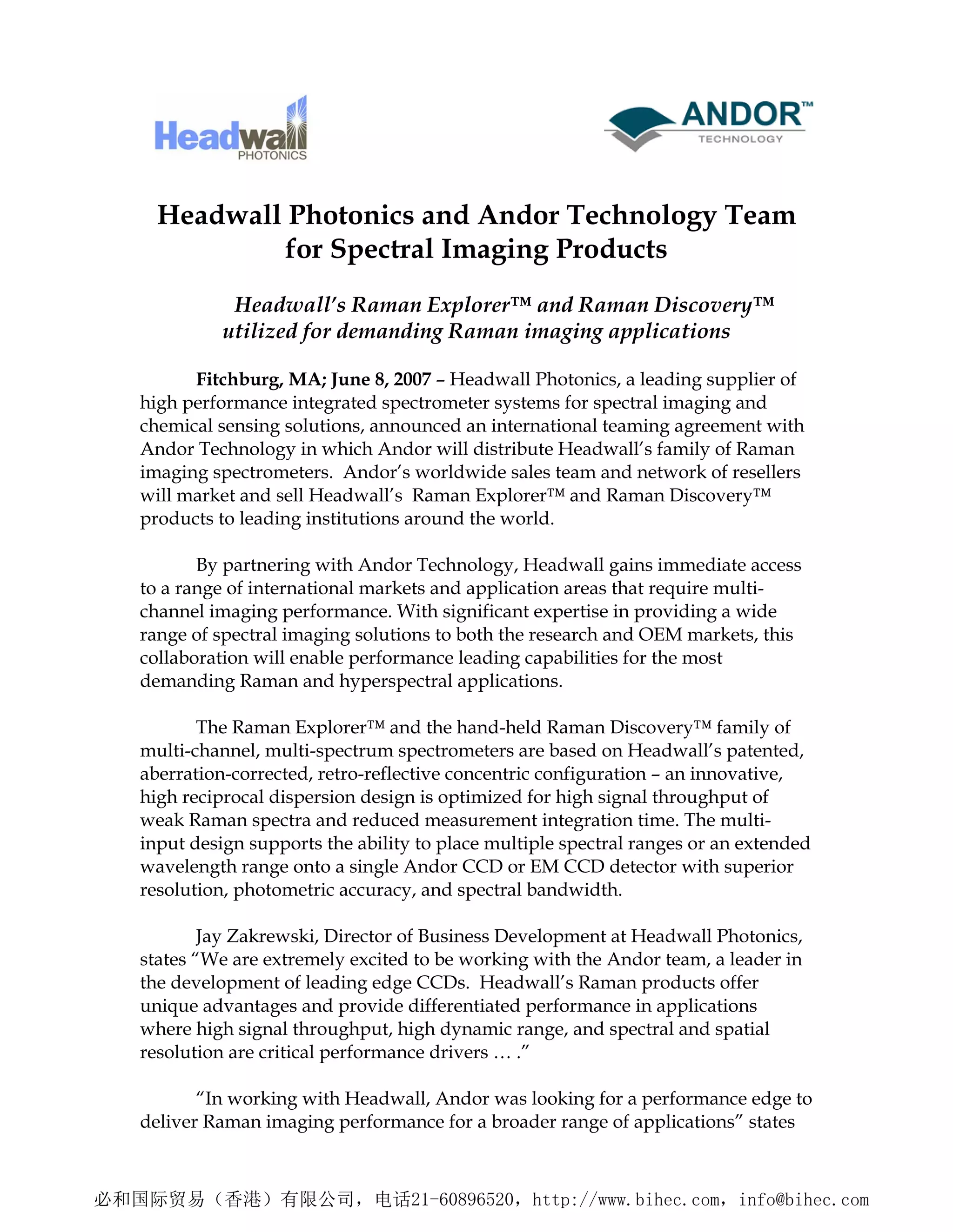 Headwall Photonics and Andor Technology have formed an international partnership where Andor will distribute and sell Headwall's Raman Explorer and Raman Discovery spectral imaging products worldwide. The partnership will provide Headwall access to new international markets and applications, while Andor gains access to Headwall's innovative spectrometer designs that combine with Andor cameras to enable leading Raman and hyperspectral imaging capabilities. The Raman Explorer and Discovery products are optimized for demanding Raman applications requiring high throughput, dynamic range, and spectral and spatial resolution.