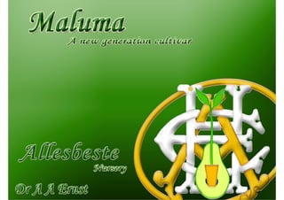 Maluma was selected in the early 1990s in South Africa as a chance seedling of unknown parentage similar to Hass. It has been granted plant breeder's rights in South Africa and registration is pending in several other countries. Maluma bears fruit earlier than Hass, has a constant and high bearing pattern, and is highly productive even at high densities without growth retardants. It offers advantages over Hass such as disease resistance, attractive appearance, excellent taste, and suitability for early season markets.