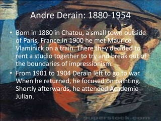 Andre Derain was a French painter born in 1880 who helped pioneer Fauvism. He met fellow artist Maurice Vlaminick in 1900 and they decided to rent a studio together to break from Impressionism. Derain focused on painting after returning from war in 1904 and was later hired to compose a series of paintings of London in 1906. He married Alice Derain in 1907 and designed a ballet in 1919 that inspired many of his later works. Derain was awarded the Carnegie prize in 1928 and began exhibiting worldwide, though he was later publicly condemned for accepting an invitation to visit Germany during World War 2. Derain died in 1954 from injuries sustained in a car accident.