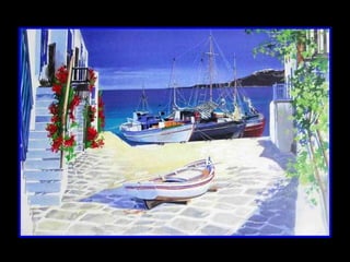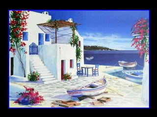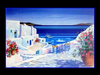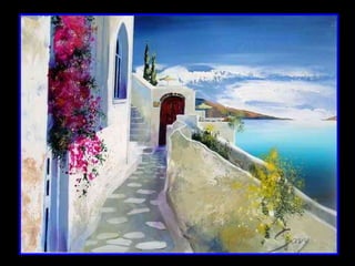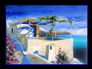 French painter André Savy creates inviting scenes featuring the crisp white-washed architecture of Greek islands like Mykonos and Santorini against the mythic blues of the Aegean region, drawing artistic inspiration from these islands and their gentle pace of life during his frequent visits to capture the unique clarity of the Aegean light.