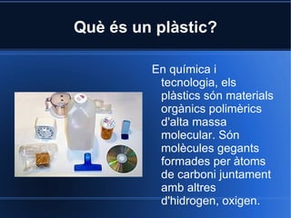 Què és unplàstic? En química i tecnologia, els plàstics són materials orgànics polimèrics d'alta massa molecular. Són molècules gegants formades per àtoms de carboni juntament amb altres d'hidrogen, oxigen.