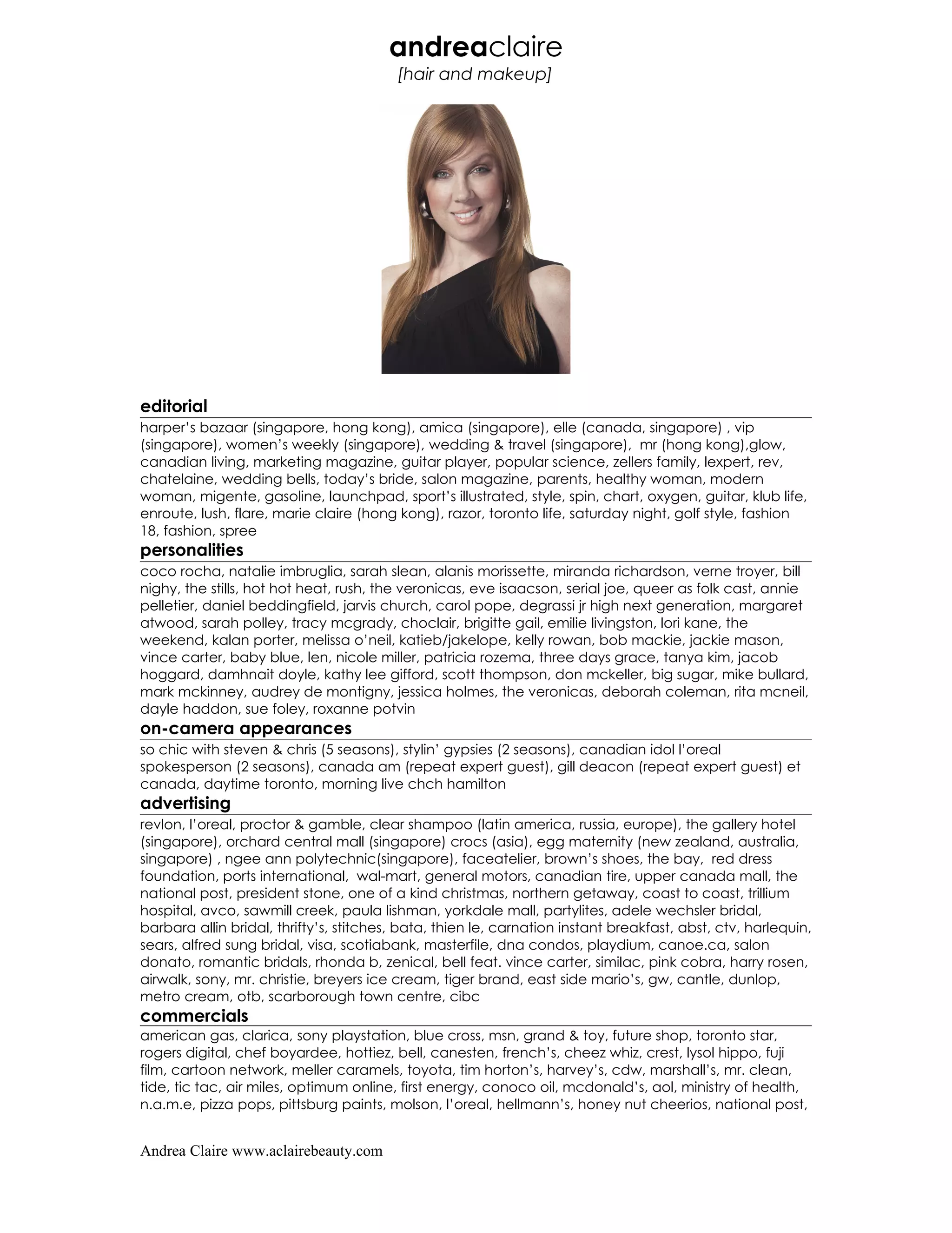 Andrea Claire is a celebrity hair and makeup artist who has worked with many famous personalities in editorial, advertising, and on-camera. She has over 20 years of experience and has worked on major ad campaigns, television shows, and fashion shows. She specializes in hair, makeup, nails and has judged hair competitions. She regularly contributes articles to beauty publications and supports several charities.