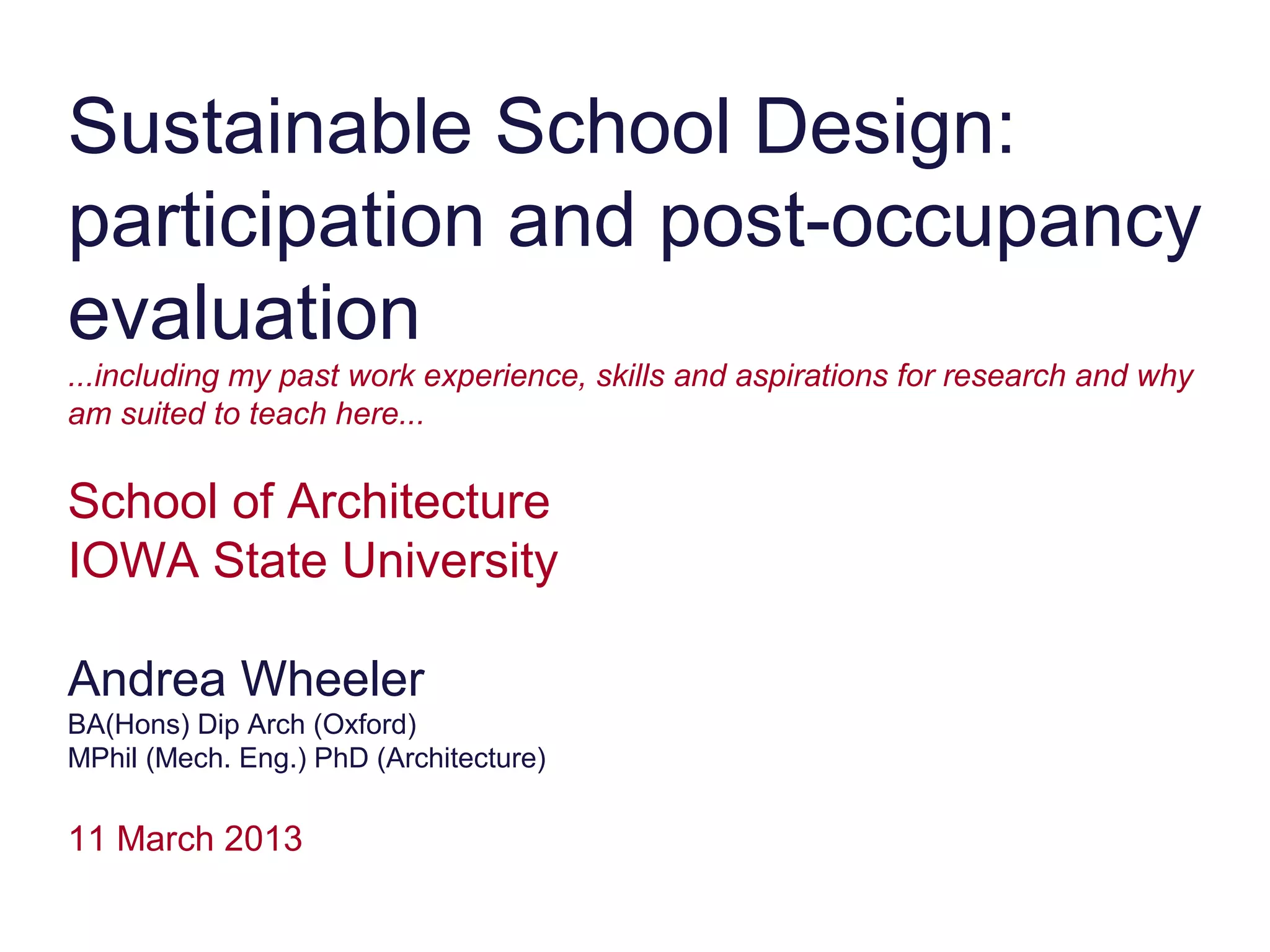 1. The document outlines Andrea Wheeler's background, teaching interests, and research focus on sustainable school design and participatory methods.
