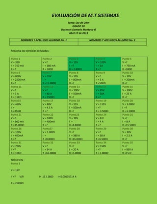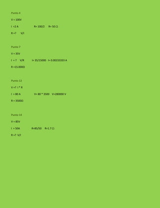 Il documento è un'assegnazione di esercizi di valutazione sui circuiti elettrici basati sulla legge di Ohm per studenti di grado 10. Gli esercizi richiedono agli studenti di risolvere vari problemi relativi a tensione, corrente e resistenza, fornendo valori noti e calcolando quelli mancanti. Include numerosi punti di esercizi con dati specifici per l'applicazione della legge di Ohm.