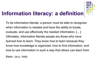 This document discusses information literacy and its role as a catalyst for educational change. It begins by defining information literacy and outlining some of its key aspects. It then examines some of the challenges of implementing information literacy in higher education, such as supporting lifelong learning skills, developing a learning culture, and addressing diverse student needs through flexible teaching approaches. The document argues that information literacy can empower both learners and librarians when implemented through a clear collaborative strategy between faculty, libraries, and administrators. When adopted as a pedagogical framework, information literacy can support lifelong learning and increase institutional and national competitiveness.