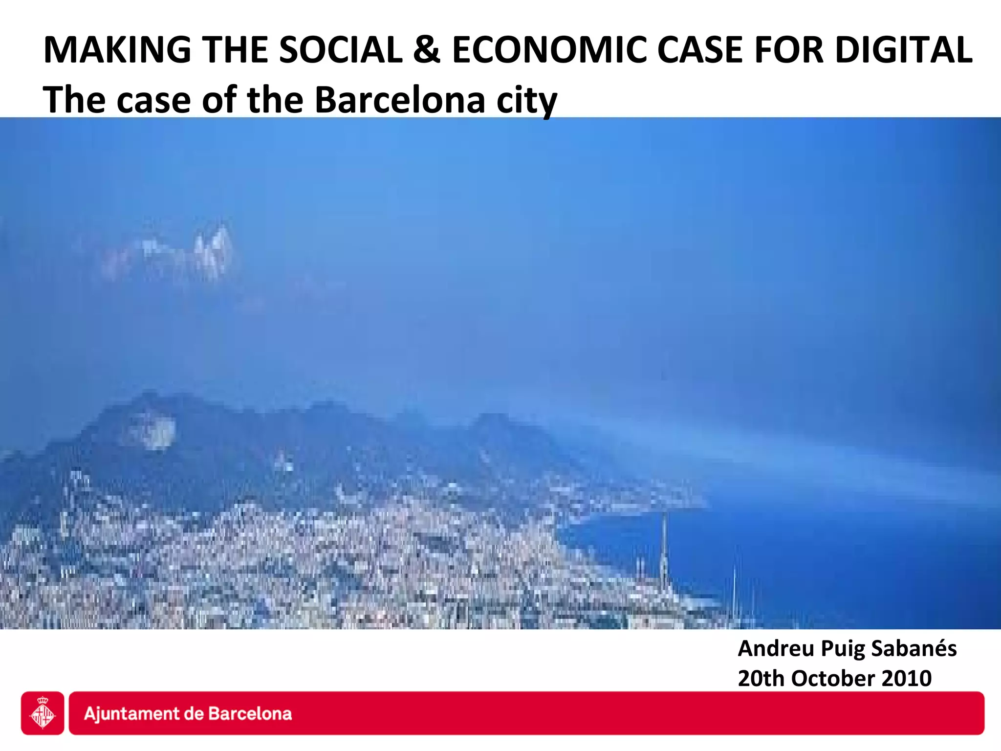 The document discusses the transformation of Barcelona into a smart city through the development of its digital sector and innovation infrastructure. It outlines the Barcelona 2.0 initiative aimed at improving public services and economic efficiency, emphasizing technological advancements and social cohesion. Key aspects include enhancing mobility, e-administration, and engaging with leading tech companies to foster a vibrant urban ecosystem.