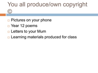 This document provides an overview of Creative Commons licenses for copyrighted work. It explains that Creative Commons licenses offer a flexible way to let others use copyrighted work while still protecting the owner and user. The licenses are divided into two groups - one that allows commercial use and one that does not. Within each group, the licenses become more restrictive based on four elements: attribution, non-commercial use, no derivatives, and share alike. In total there are six Creative Commons licenses that range from more open to more restrictive based on these elements.