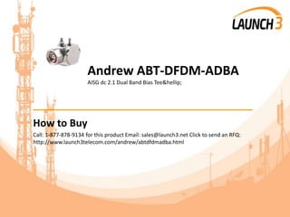 This document provides product specifications for an Andrew ABT-DFDM-ADBA AISG dc 2.1 Dual Band Bias Tee Surge Arrestor. It includes details on interfaces, frequency bands, electrical specifications, mechanical specifications, environmental specifications, power supply specifications, and regulatory compliance. The bias tee passes both DC and 2.176 MHz subcarrier signals and has interfaces of DIN Female and DIN Male with SMA connectors. It provides lightning surge protection and operates in frequency bands from 698-2180 MHz.
